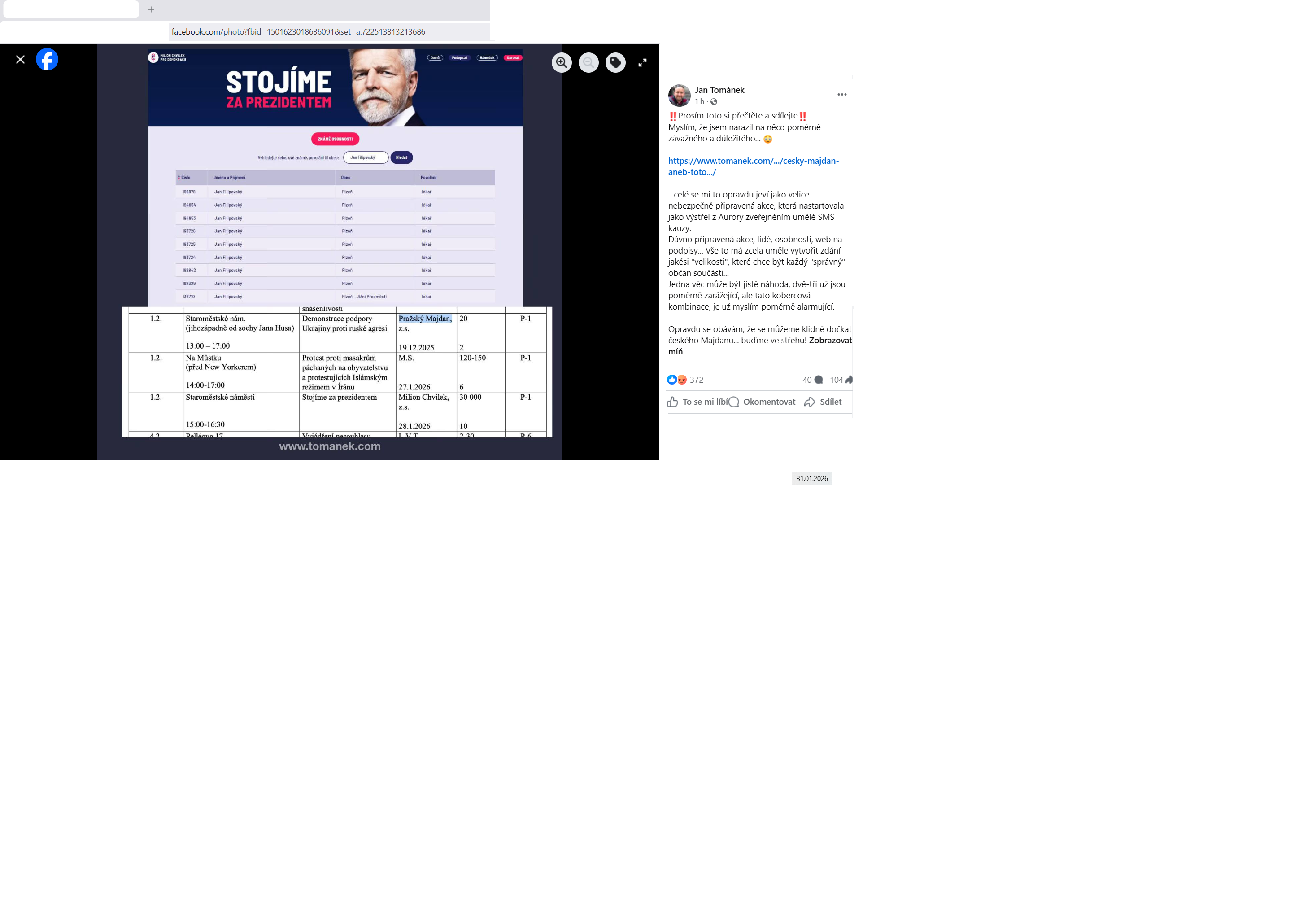 Toto uveřejnil Jan Tomanek ohledně zítřejší demonstrace Milionu chvilek. Jsou k tomu printscreeny a tu je odkaz na tento článek: https://www.tomanek.com/2026/01/cesky-majdan-aneb-toto-opravdu-smrdi/