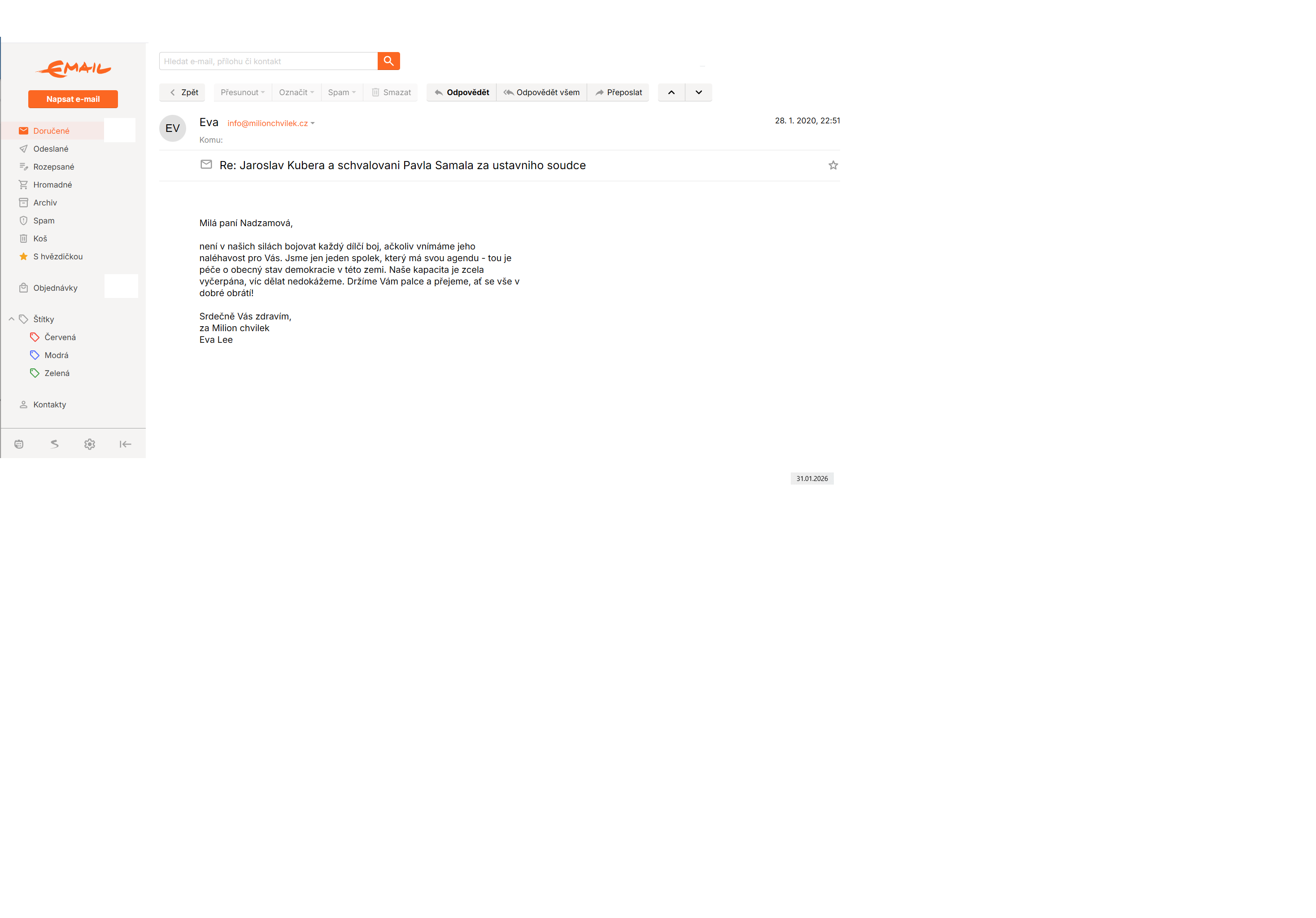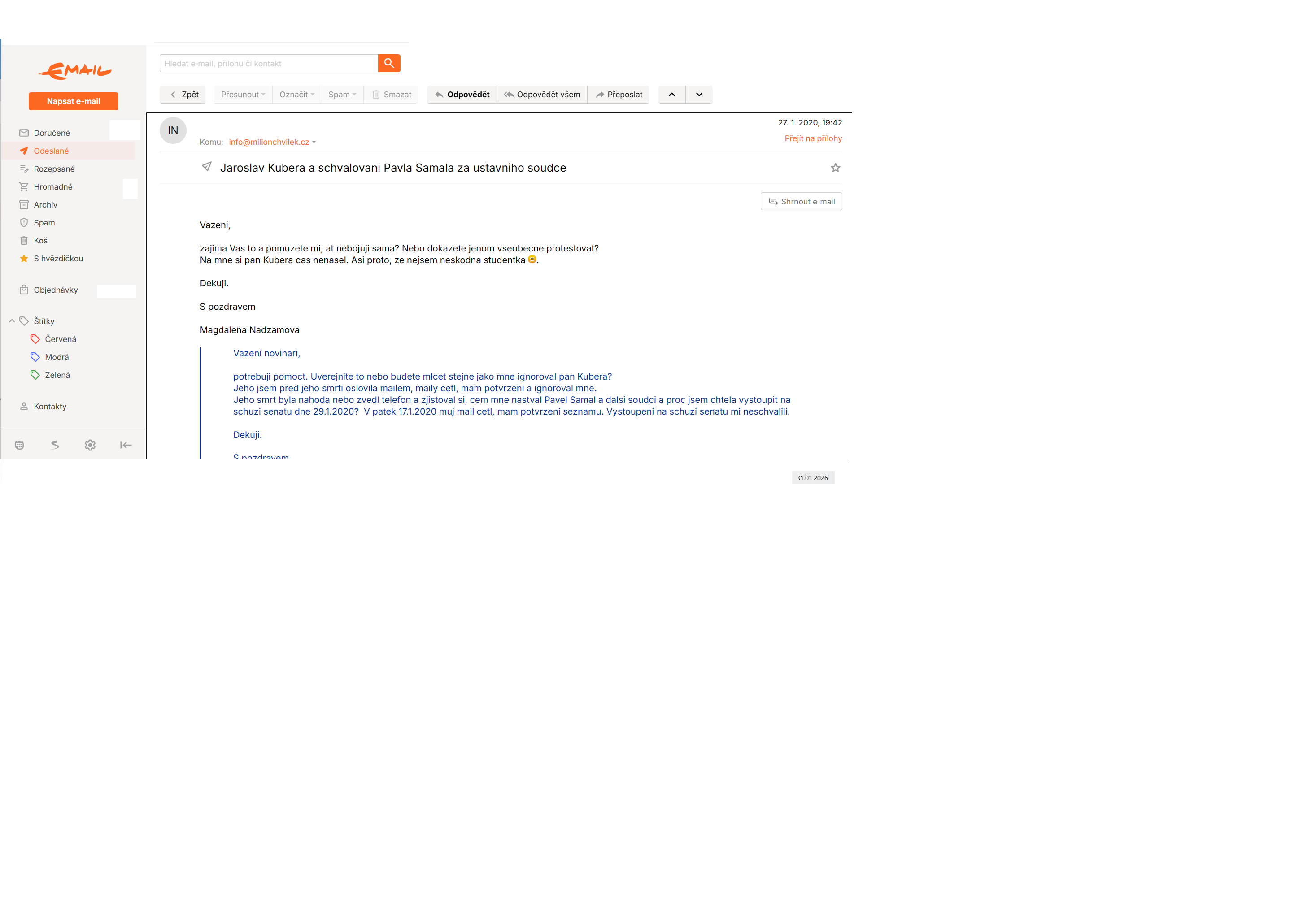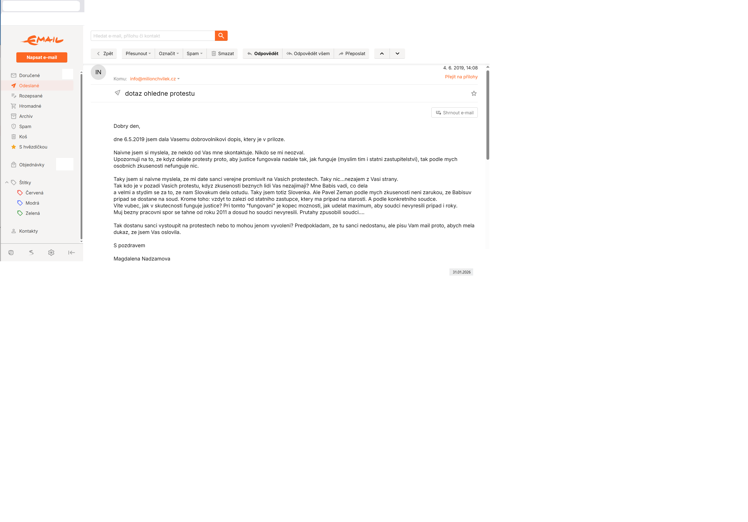 Milion chvilek, můj mail rok 2019. Neodpověděl mi nikdo.